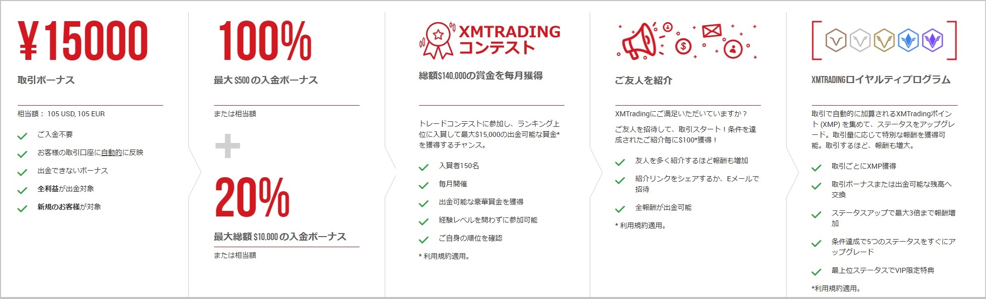 XMTradingでは、3つのボーナスキャンペーン(口座開設ボーナス、入金ボーナス、ロイヤルティプログラム)を随時開催していますが、口座のタイプにより適用されるボーナスが異なります。