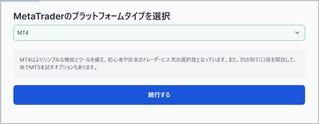 次に「取引プラットフォーム」を選択し「続行する」をクリックします。