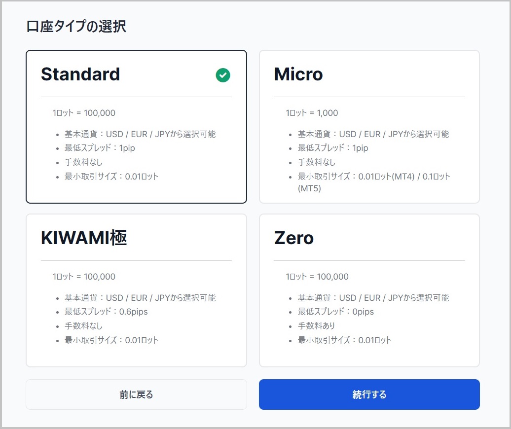 「口座タイプ」を4つの中から選択し「続行する」をクリックします。