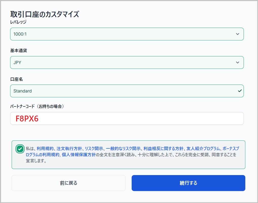パートナーコードの欄は、「F8PX6」と入力することで、TariTaliに紐づいた口座が開設されます。
