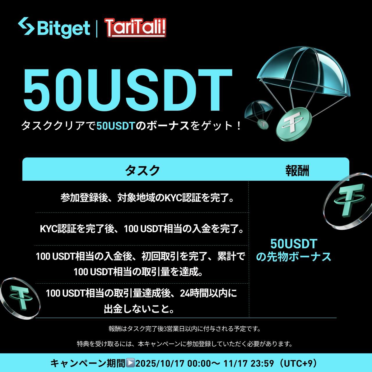 Bitgetでは、TariTaliでのリリースを記念し、タイアップ企画「新規限定!50USDT先物ボーナスキャンペーン」を開催しています。