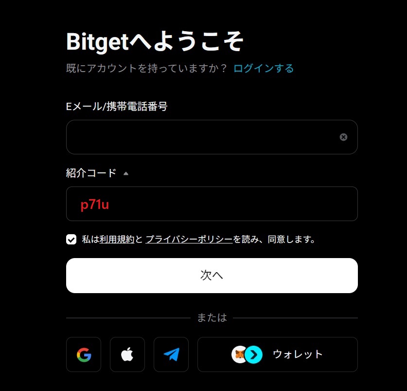 まずは以下のリンクボタンをクリックし、Bitgetの口座開設ページを開きます。