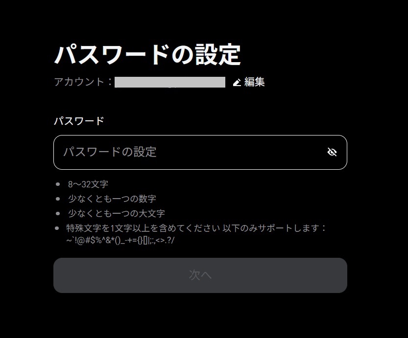 アルファベットの大文字、小文字、特殊文字、数字を含む8~32文字のパスワードを設定し「次へ」をクリックします。