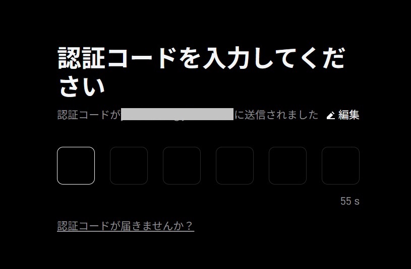 登録したメールアドレス宛に届く6桁の認証コードを入力します。
