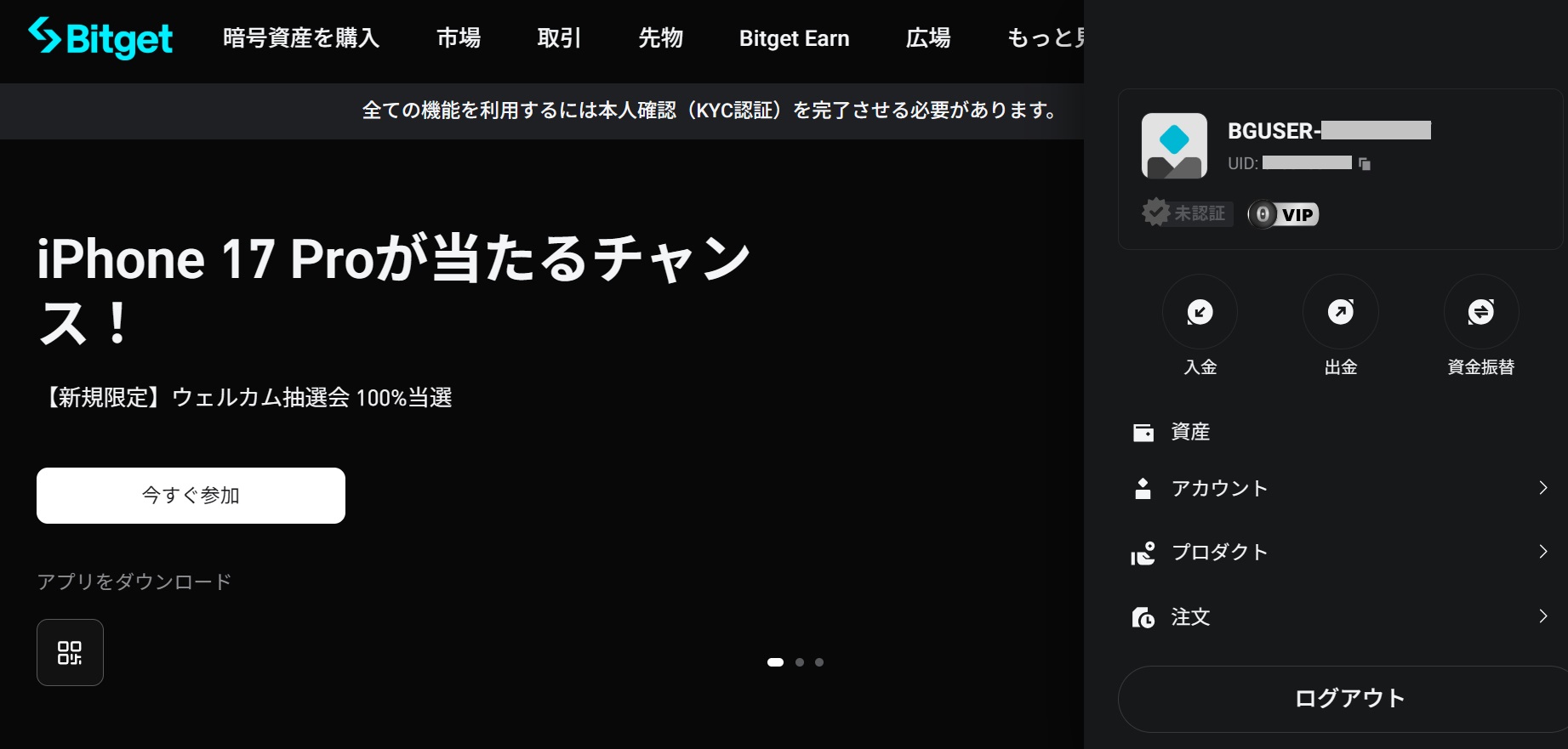 Bitgetにログインし、アイコン下の「未認証」をクリックするか、右側メニューをスライドし「本人確認(KYC)」をクリックします。