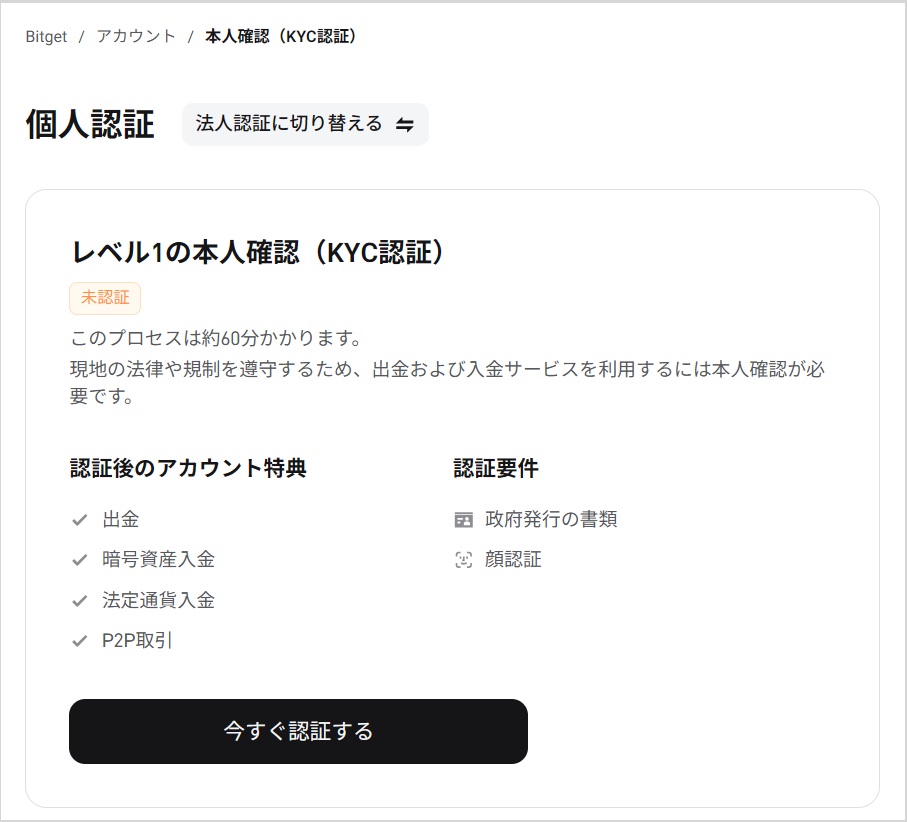 審査は完了までに最大60分程度かかり、完了すると、出金、暗号資産と法定通貨の入金、P2P取引が可能になります。