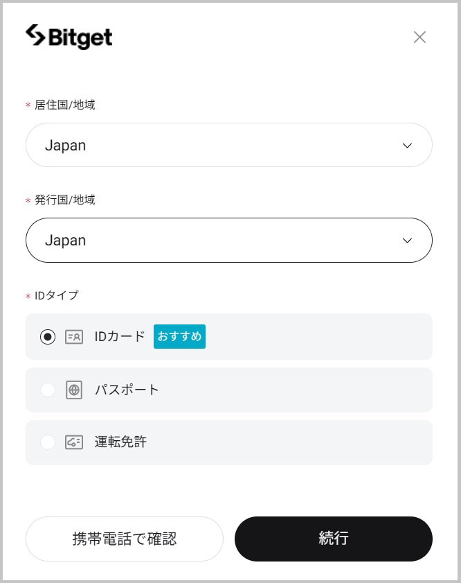 「居住国/地域」と「発行国/地域」を確認し、提出する書類を、IDカード(マイナンバーカード)、パスポート、運転免許証の中から選択し「続行」をクリックします。