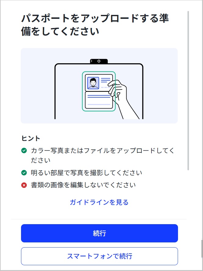 本人確認(KYC認証) を行う際には、IDカード(マイナンバーカード)、パスポート、運転免許証のいずれか一点が必要になります。