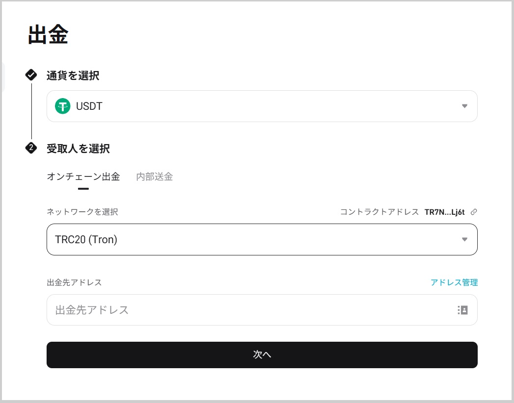 ネットワークを選択後、出金先アドレスを入力し「次へ」をクリックします。