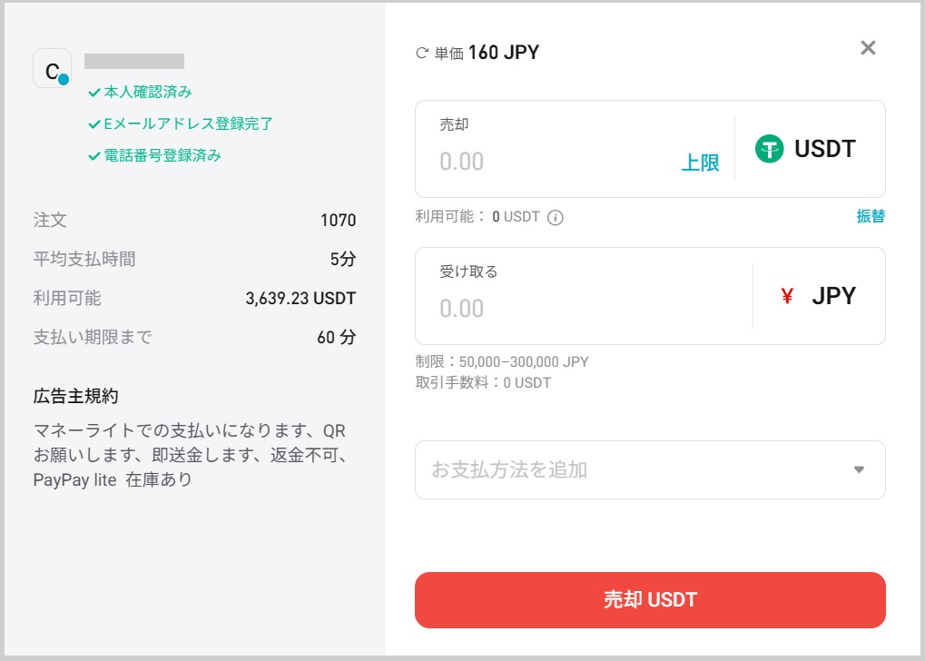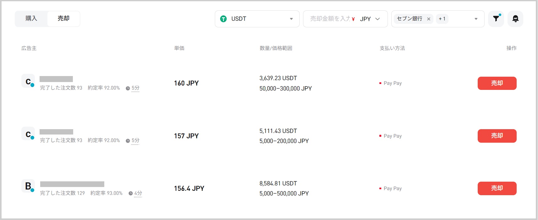 「売却」のタブを開き、通貨の種類や希望額、支払い方法を入力し広告主を絞り込みます。