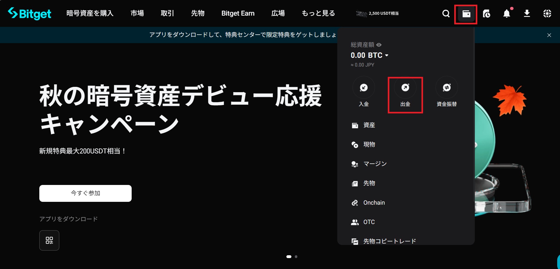 まず、トップページ右上にあるお財布マークをクリックし、「出金」をクリックします。