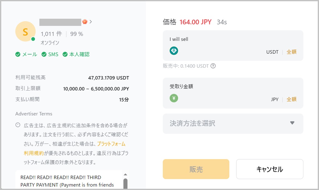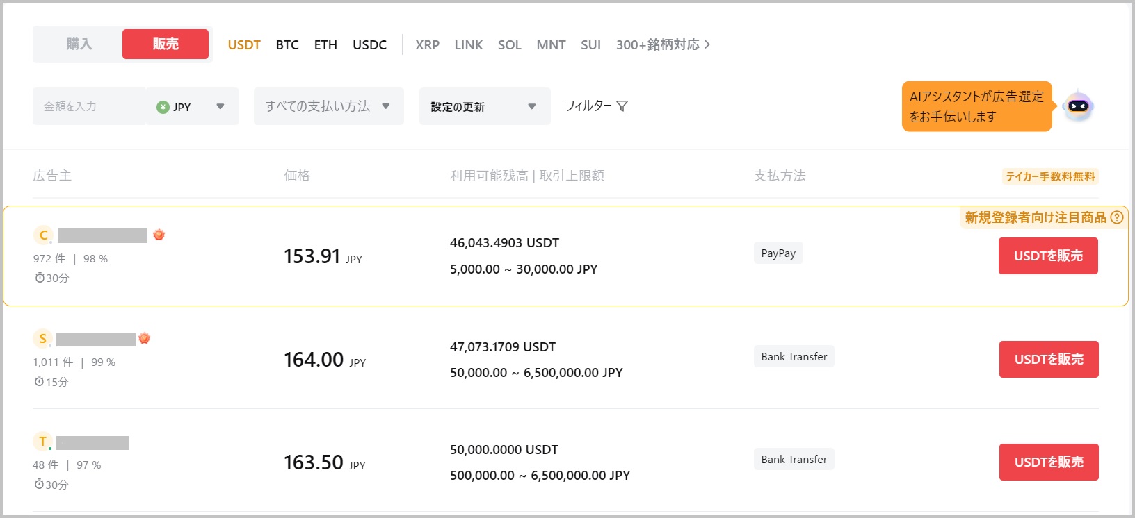 「販売」のタブを開く、通貨の種類や希望額、支払い方法を入力し広告主を絞り込みます。