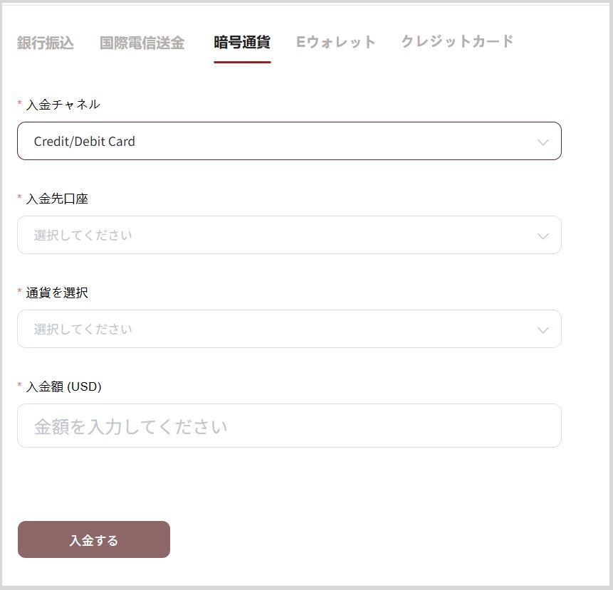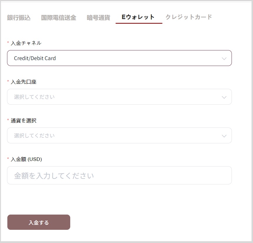 「入金チャネル」、「入金先口座」、「通貨」、「入金額」を選択し、「入金する」をクリックします。