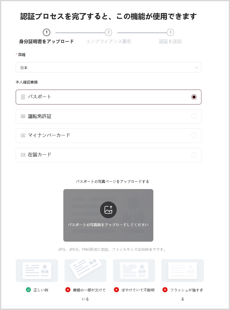 スムーズにアップロードできるよう、以下のいずれかの本人確認書類をあらかじめお手元にご用意しておくことをおすすめします。