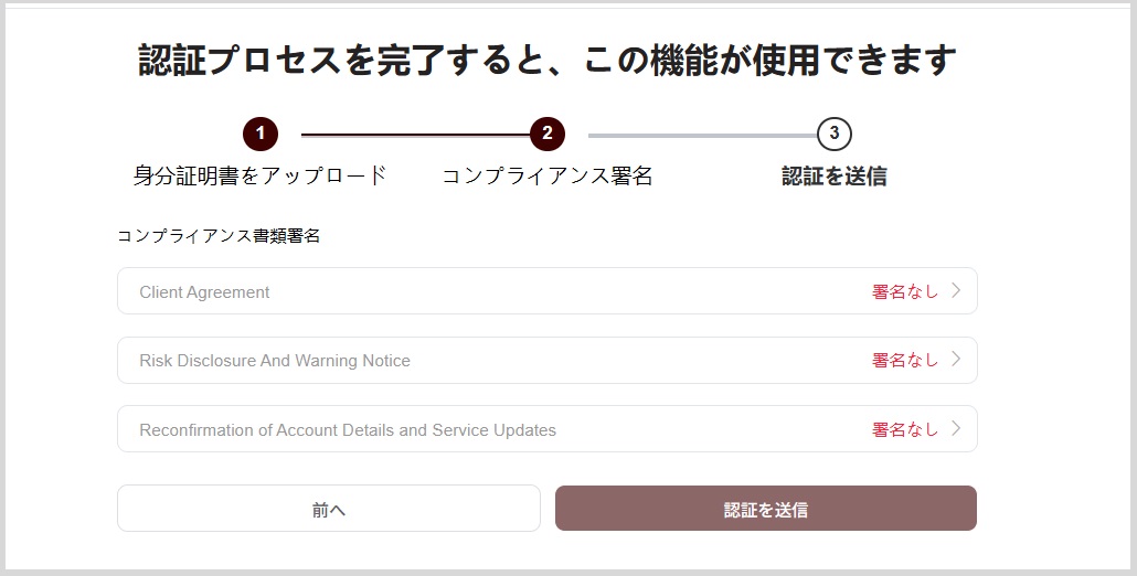 Client Agreement(クライアント契約書)、Risk Disclosure And Warning Notice(リスク開示および警告通知)、Reconfirmation of Account Details and Service Updates(アカウント情報およびサービス更新内容の再確認)にそれぞれ署名を行い、「認証を送信」をクリックします。