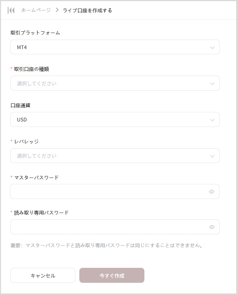 パスワードを設定し、「今すぐ作成」をクリックします。