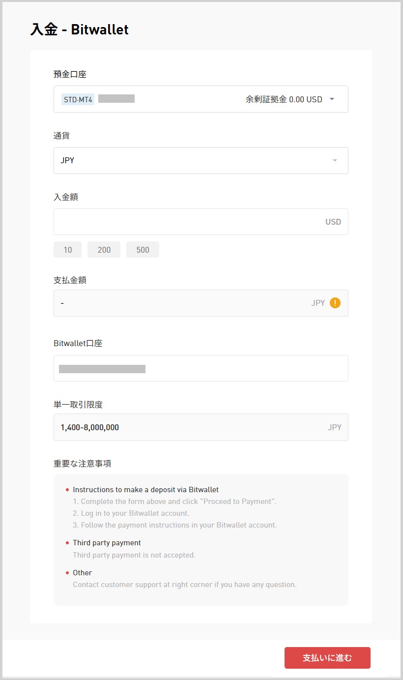 入金額を入力し、bitwalletのメールアドレスを入力後、「支払いに進む」をクリックします。