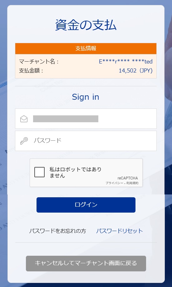 bitwalletの決済画面にリダイレクトされるので、ログインします。