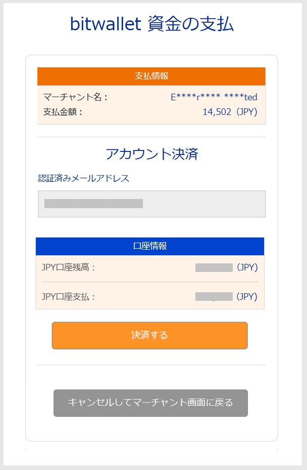 送金金額と口座情報を確認し「決済する」をクリックすれば、bitwalletによる入金は完了です。