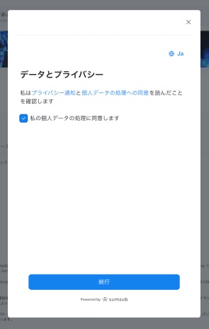 データとプライバシーに関する規約を確認後、チェックボックスにチェックを入れ「続行」をクリックします。