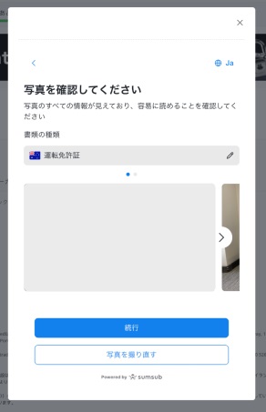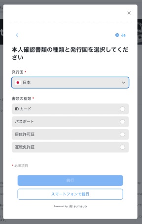 本人確認書類の発行国と種類を選択し「続行」をクリックします。