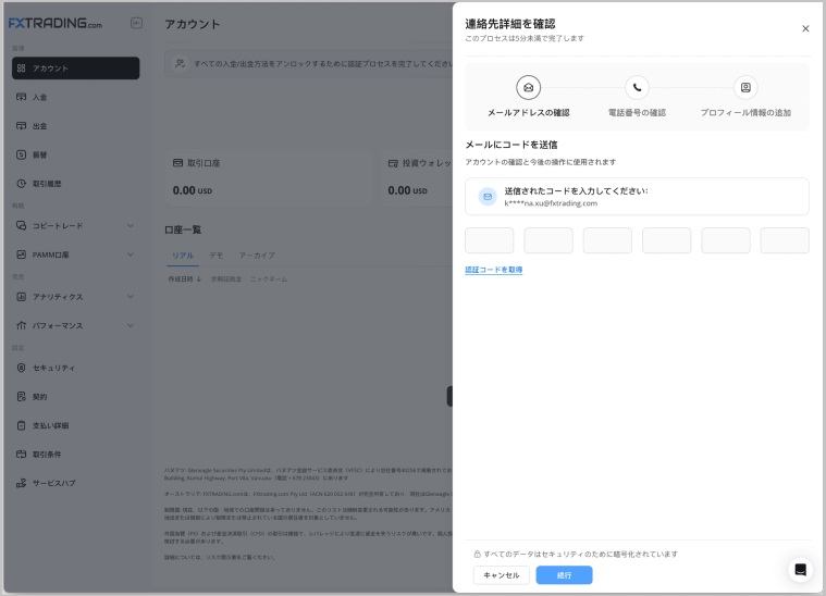 まずは、メールアドレスの確認を行うので「認証コードを取得」をクリックし、登録したメールアドレス宛に送信された6桁のコードを入力し「続行」をクリックします。