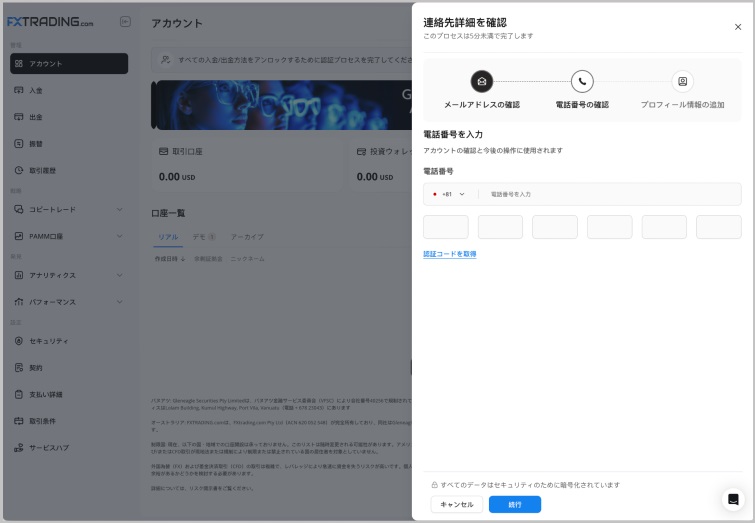 携帯番号を入力後、「認証コードを取得」をクリックし、SMSに送信された6桁のコードを入力します。