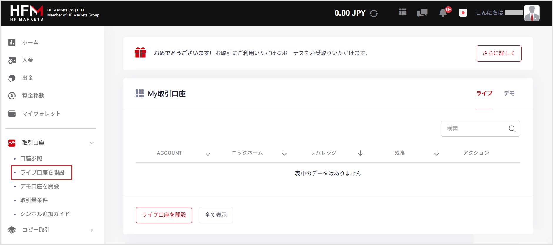 画面左側にある「取引口座」メニューをクリックし「ライブ口座を開設」をクリックします。