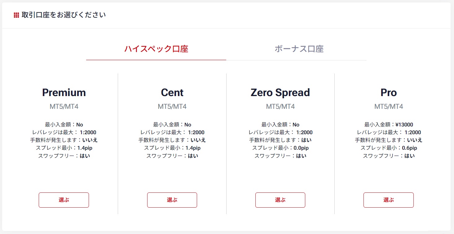 口座タイプを5つの中から選択します。(トップアップボーナス口座は、ボーナス口座のタブの中にあります。)