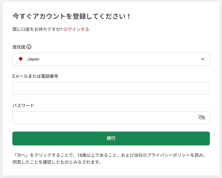 「居住国」、「Eメールアドレスまたは電話番号」、「パスワード」を入力します。