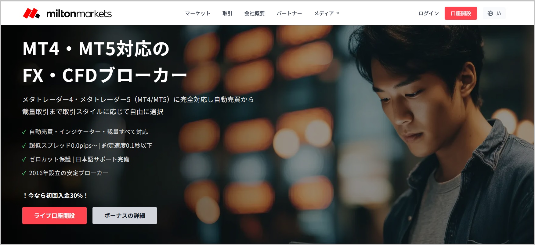 MiltonMarketsは、2015年末に設立されたFX業者で、エクイニクス社のバックボーンを利用した取引環境と、日本人個人投資家のニーズであるハイレバレッジとボーナスプログラムが魅力の業者です。