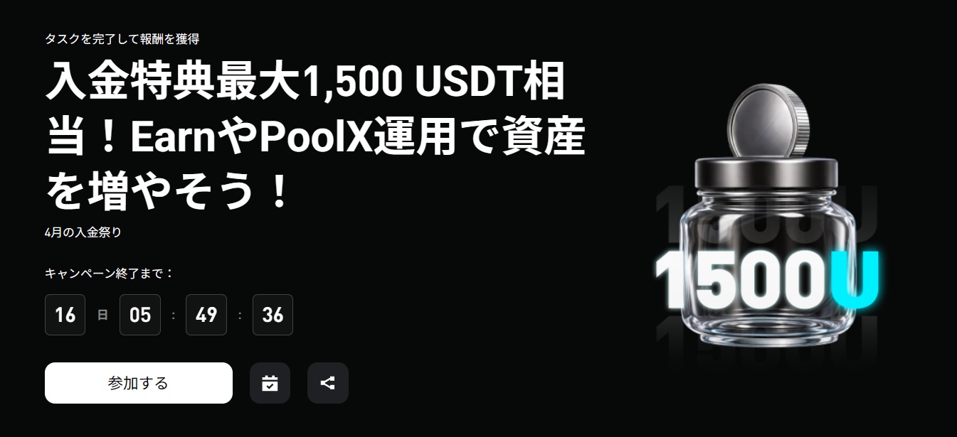 Bitgetでは現在、入金特典最大1,500USDTの「4月の入金祭り」を開催しています。