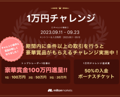 MiltonMarketsでは9月1万円チャレンジのコンテストを開催されます。 条件達成者の中で最も利益を出したトップトレーダー1名様に賞金100万円がプレゼントされますので、ぜひこの機会にご参加されてみて・・・