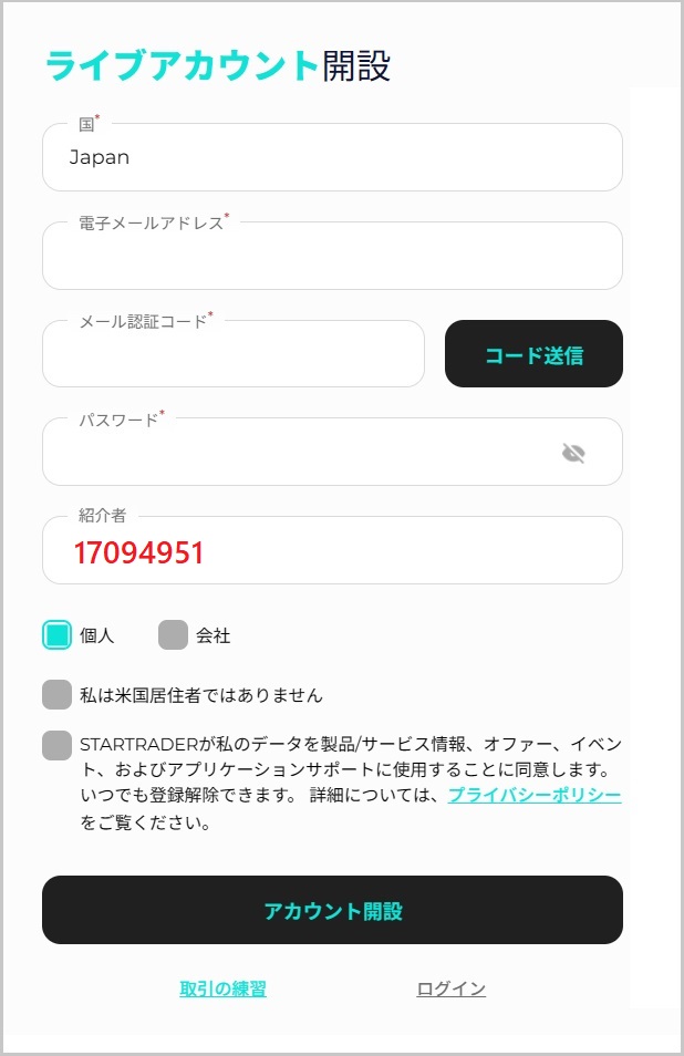 まずは以下のリンクボタンをクリックし、STARTRADERのライブ口座の申請ページを開きます。