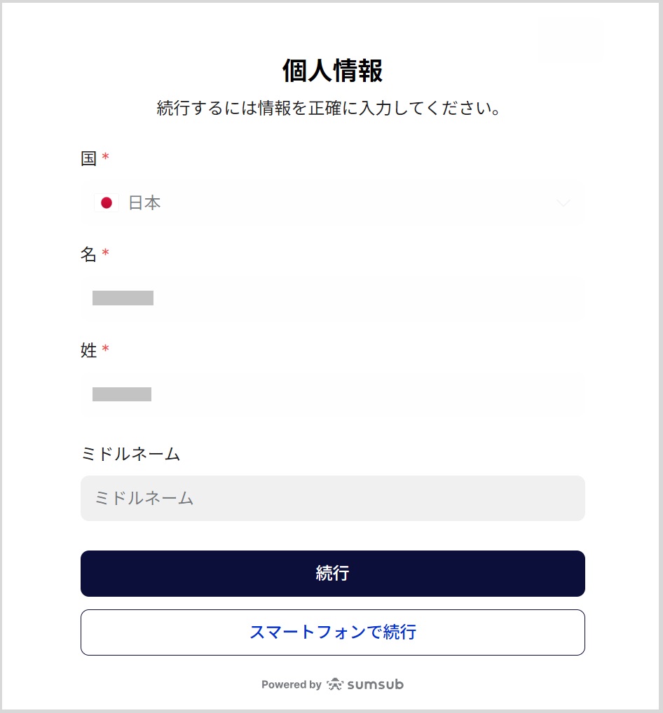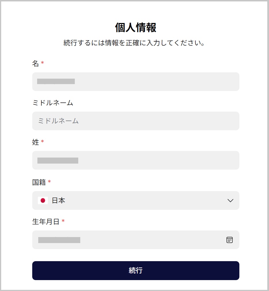 個人情報のページでは、先ほど入力した情報に間違いがないかを確認し「続行」をクリックします。
