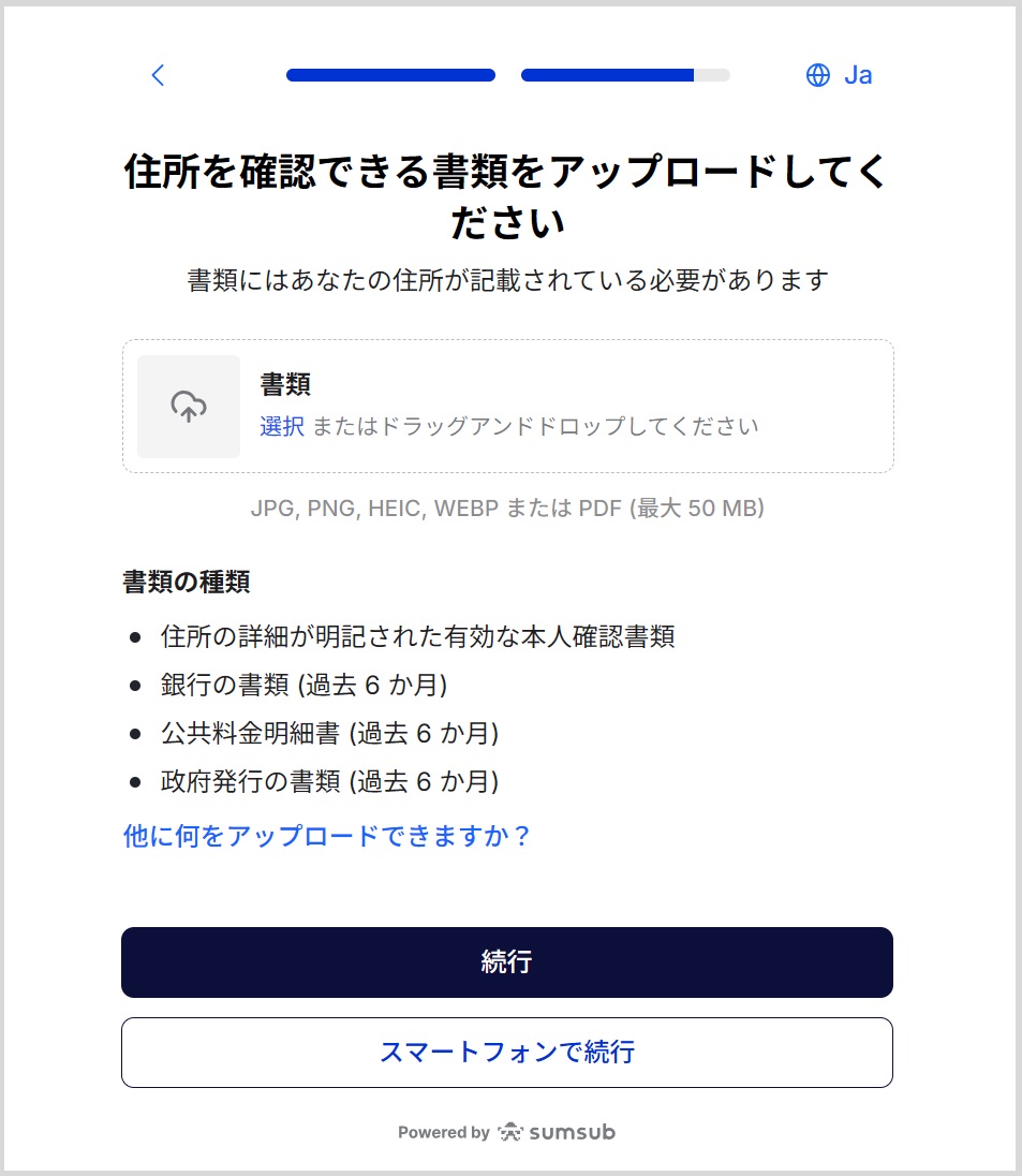 書類の提出をスマートフォンで行う場合は「スマートフォンで続行」をクリックしましょう。