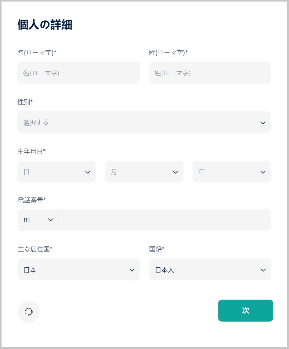 続いて「姓名(ローマ字)」、「性別」などの個人情報を入力していきます。