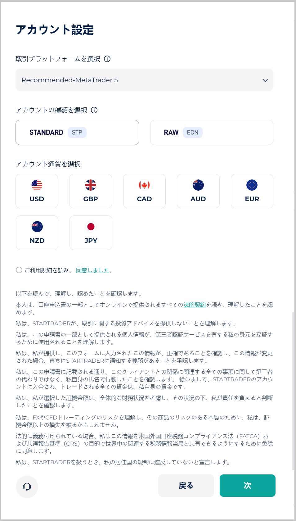 「アカウント設定」では、「取引プラットフォーム」、「口座タイプ」、「アカウント通貨」を設定します。