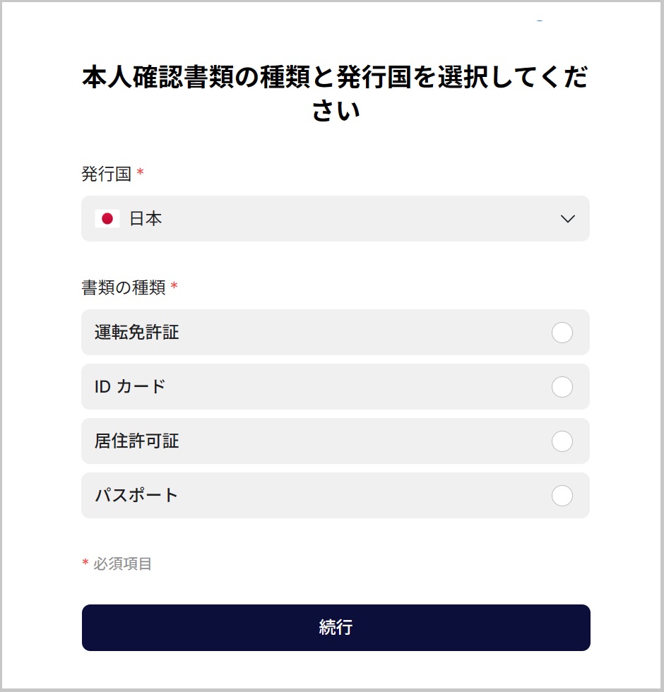 提出する本人確認書類は「運転免許証」、「IDカード」、「居住許可証」、「パスポート」の中からいずれか1点を選択し「続行」をクリックします。