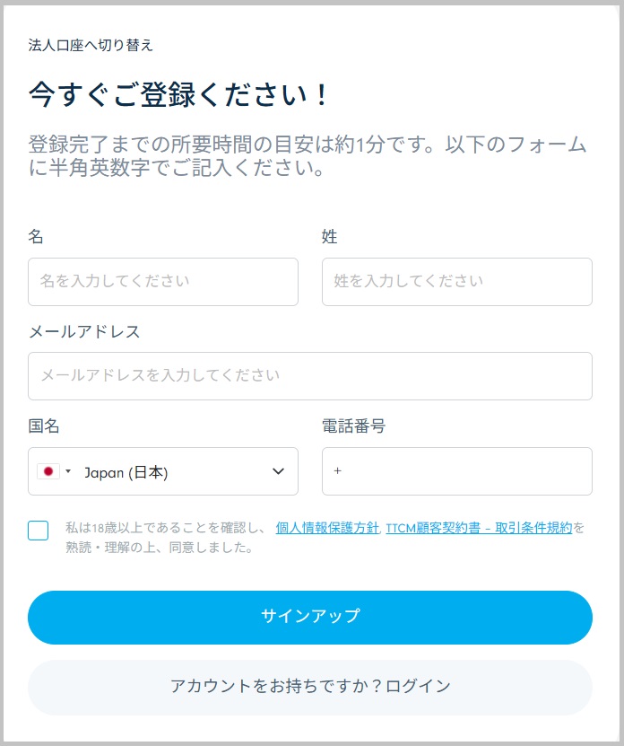 まずは以下のリンクボタンをクリックし、TTCM(TradersTrust)の口座開設ページを開きます。