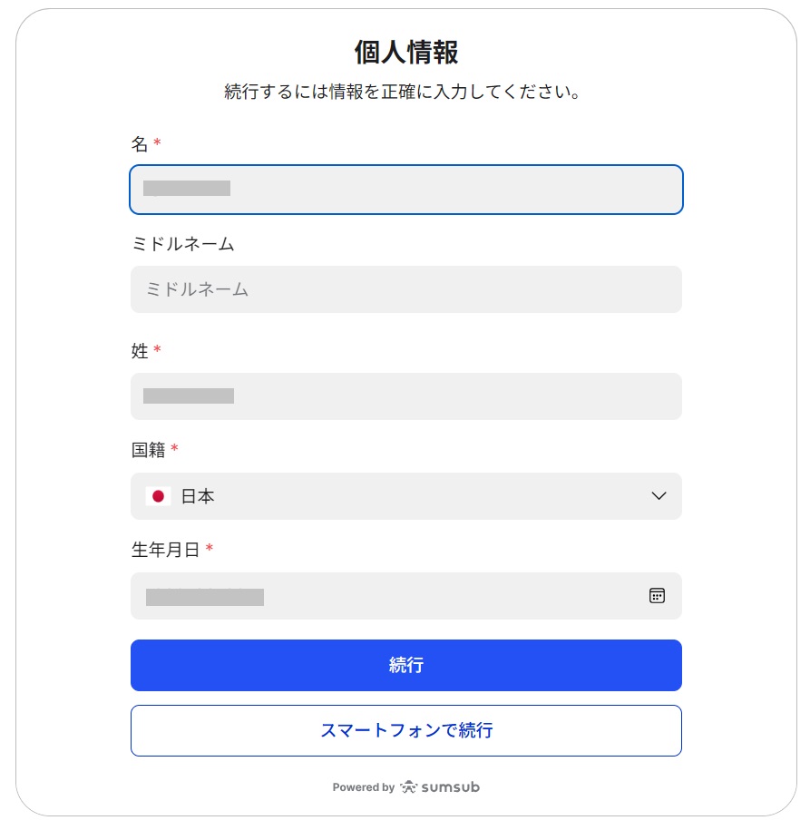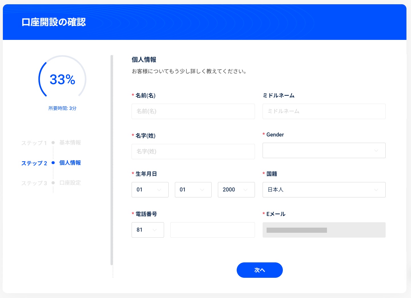 名前、生年月日などの個人情報を入力し「次へ」をクリックします。