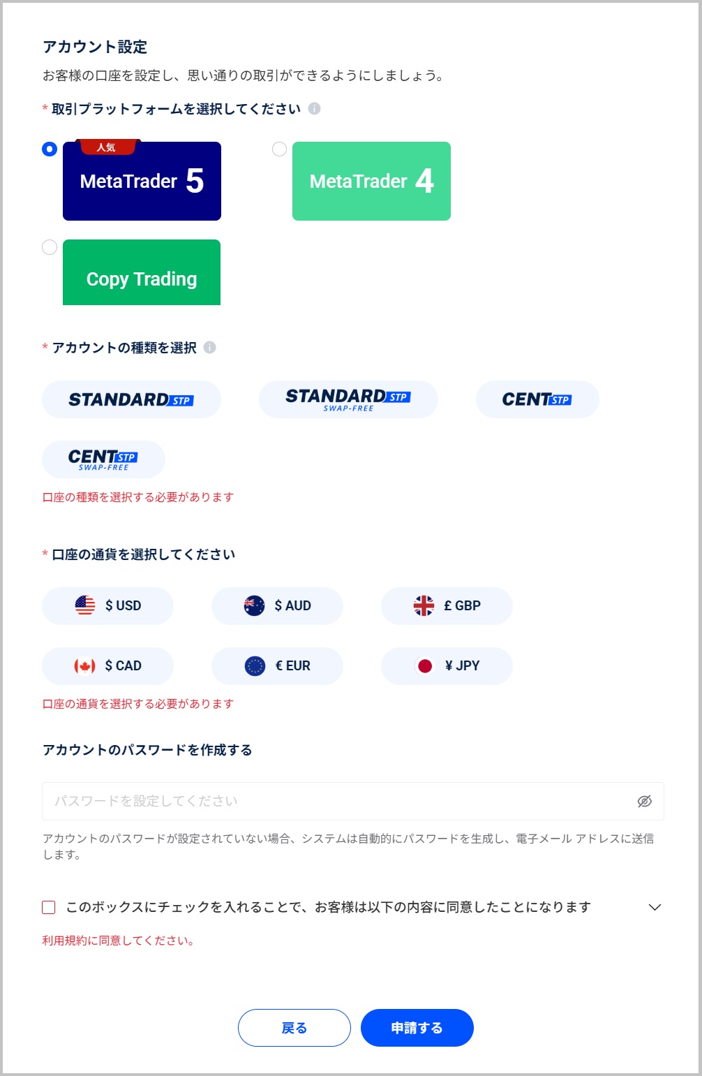 「取引プラットフォーム」、「アカウントの種類」、「口座通貨」、「アカウントのパスワード」を設定し、チェックボックスにチェックを入れ「申請する」をクリックします。