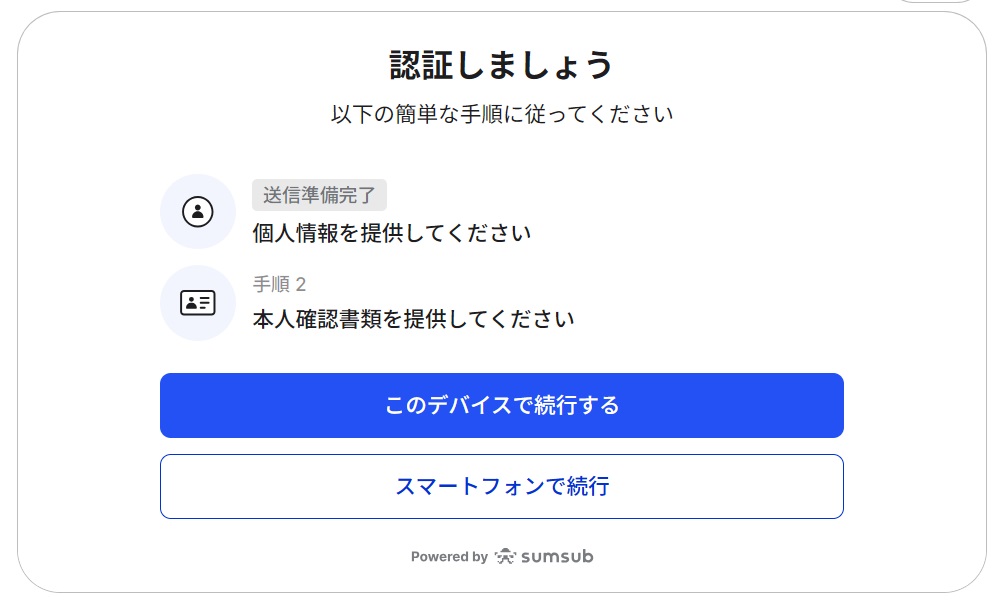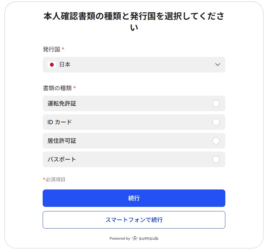 運転免許証、IDカード(マイナンバーカード)、居住許可証、パスポートの中から提出する書類を選択し「続行」をクリックします。